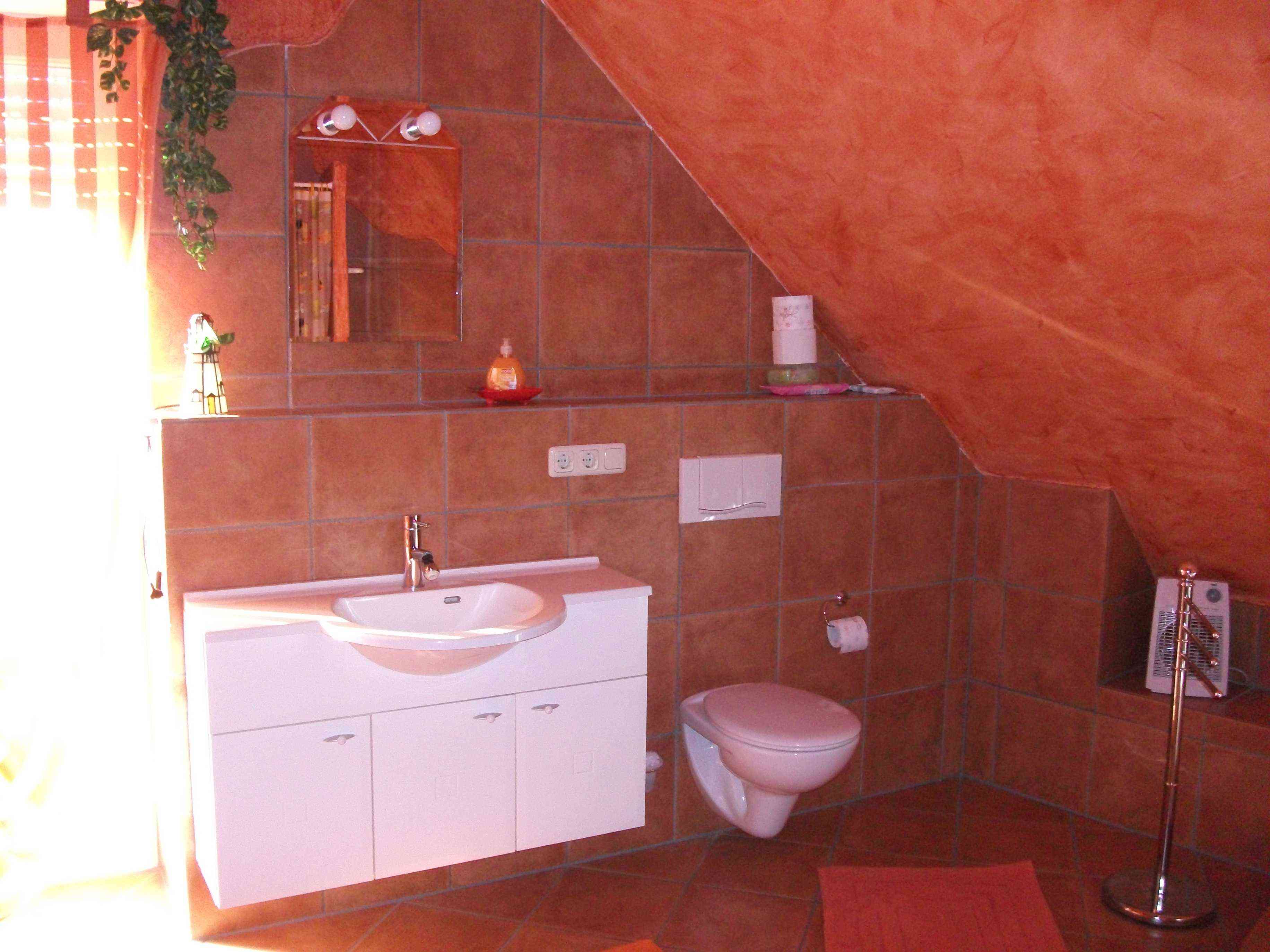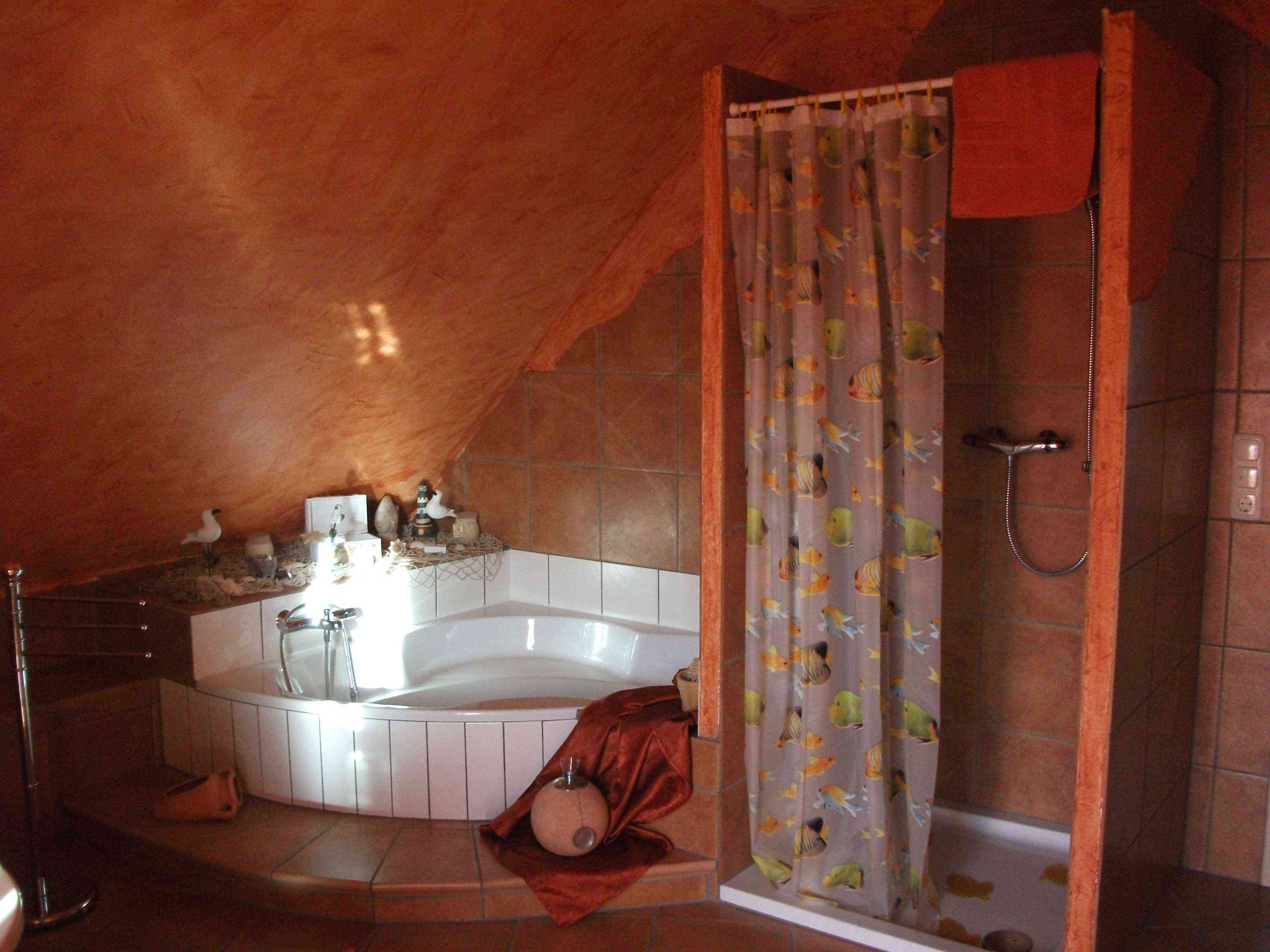 Bad: Waschtisch; Fön; Toilette; Dusche; Eckbadewanne.